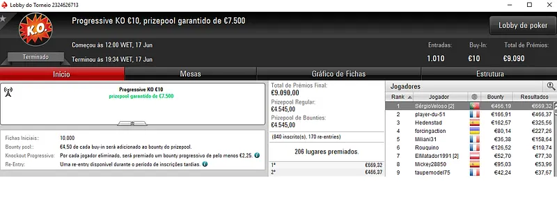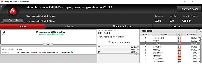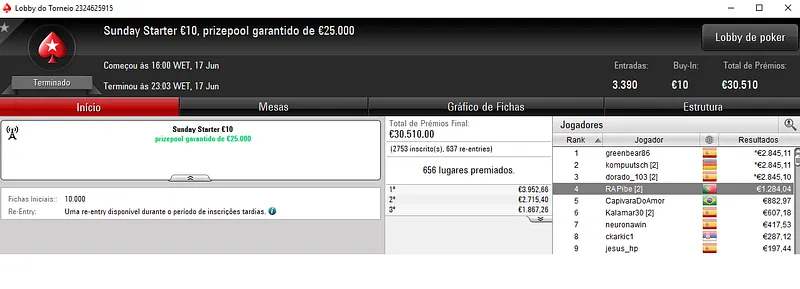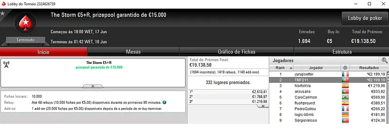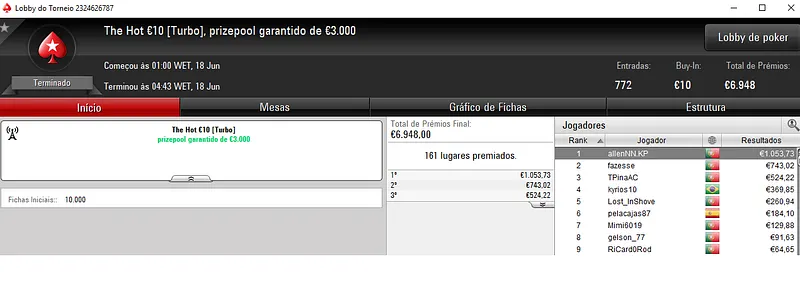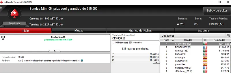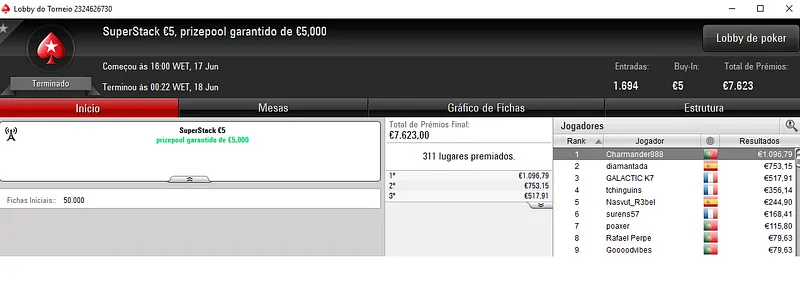 Já no Afternoon on Stars €50 houve dobradinha lusa, com Pitas_ 90 a sair campeão para €4,174 e SnapOut0f_it a receber €3,032 em segundo. Este torneio acolheu 553 entradas que se traduziram em €24,885 de prize pool.