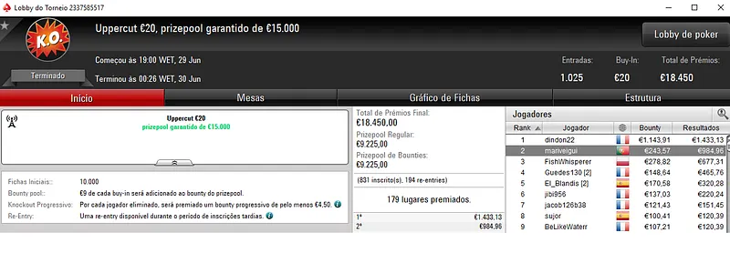 Um desses casos foi Fellini33 que se sagrou campeão do Progressive KO €50 com 411 jogadores. O jogador luso teve direito a €3,727 pelo título, depois de eliminar K0elh0 no segundo posto para €1,265. O prize pool deste torneio foi de €18,495.