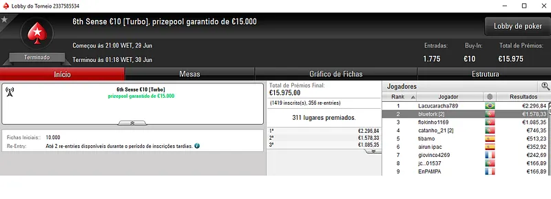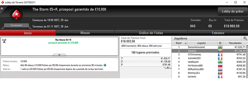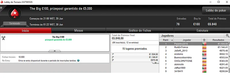 Já no The Big €20 com 672 entradas, rapinzi1988 levou para a caixa €2,052 de prémio pela vitória. O prize pool deste evento chegou aos €12,096, onde 134 jogadores saíram com prémio.