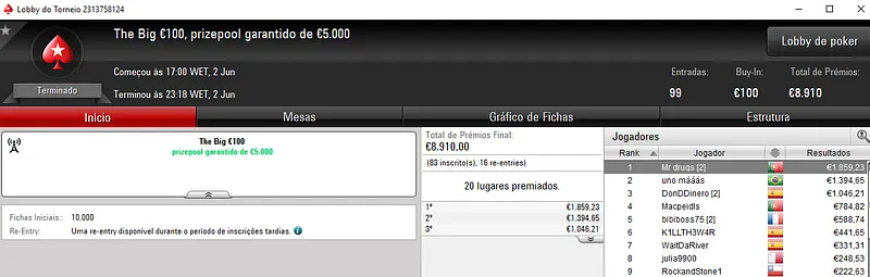 Já no Midnight Express €20 com 1,454 entradas, a medalha de bronze valeu €1,935 a JonLajoie69. O prize pool deste evento chegou aos €26,172, onde 263 jogadores saíram com prémio.