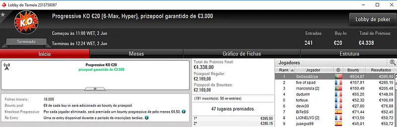 O Progressive KO €15 com 836 jogadores também foi vencido por um jogador luso. JVaGil embolsou €1,976, entre prémios e bounties pelo título deste evento. Este torneio distribuiu €11,2886 de prize pool.