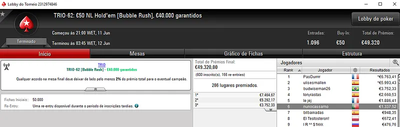 O último título apareceu no TRIO #61: €5 NLHE [6-Max] com 5,673 entradas e 25,528 de prize pool. GorditoReis realizou acordo no 3-handed e garantiu €2,968 de prémio pelo primeiro lugar da classificação. 1,007 jogadores saíram com prémio deste evento.