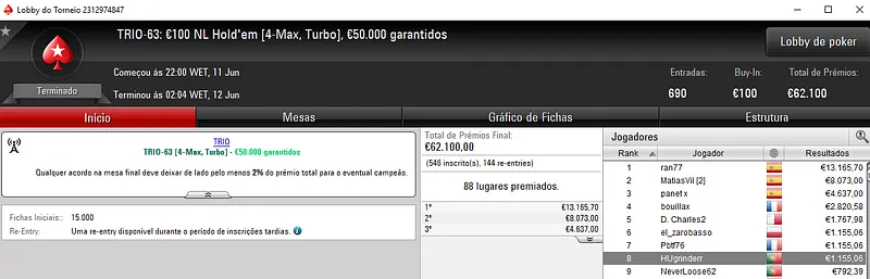 O título veio no TRIO #60: €50 NLHE [6-Max] com 1,669 entradas e €75,105 de prize pool. Dois jogadores lusos ficaram no topo da classificação, onde o título valeu €10,850 a jensjensen4. No segundo lugar, jomil21 embolsou €7,460 de prémio. No total, 287 jogadores saíram com prémio deste evento.