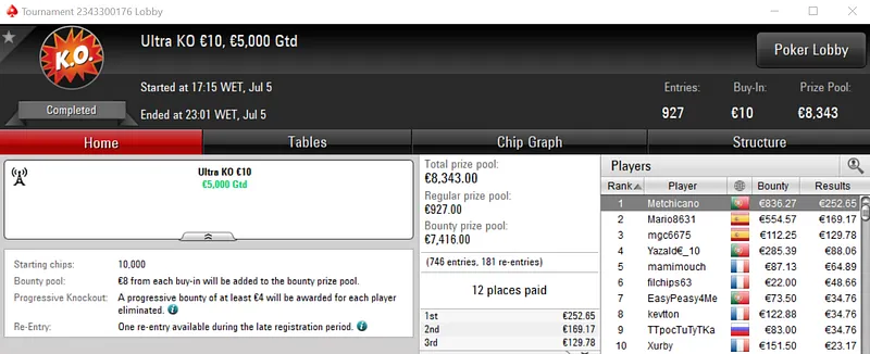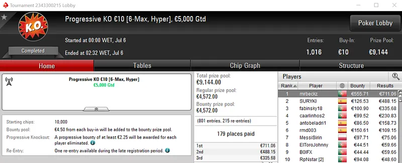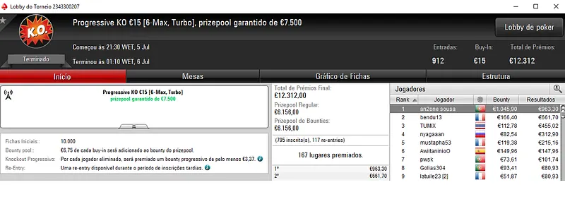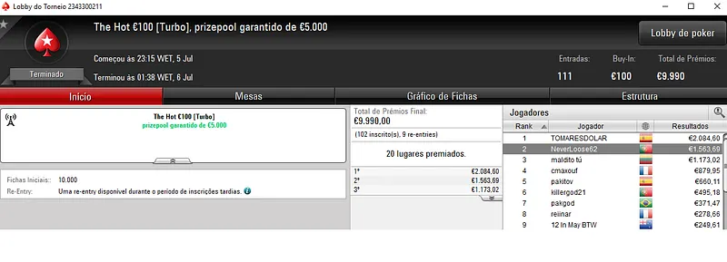 Mas este não foi o único resultado de hhtuga13 que ainda embolsou €1,230 no The Big €50 com 447 entradas. Aqui foram repartidos €20,115 pelos 89 melhores classificados, com o português a cair na quarta posição.