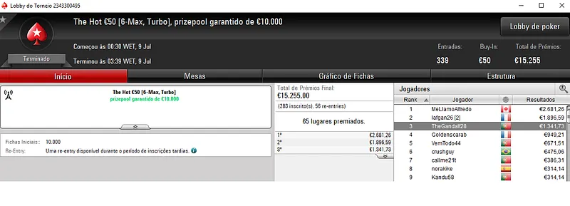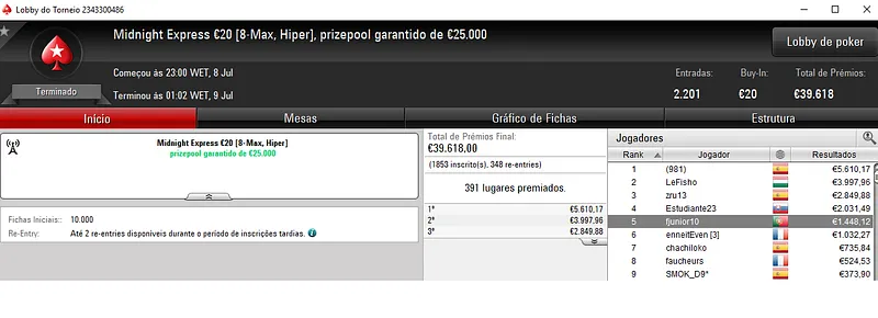 Com a divisão de prémios no Sunday 6th Sense €10, juka10993 embolsou €4,484 de recompensa. O jogador português acabou no topo da classificação neste torneio com 4,3357 entradas e €39,213 de prize pool.