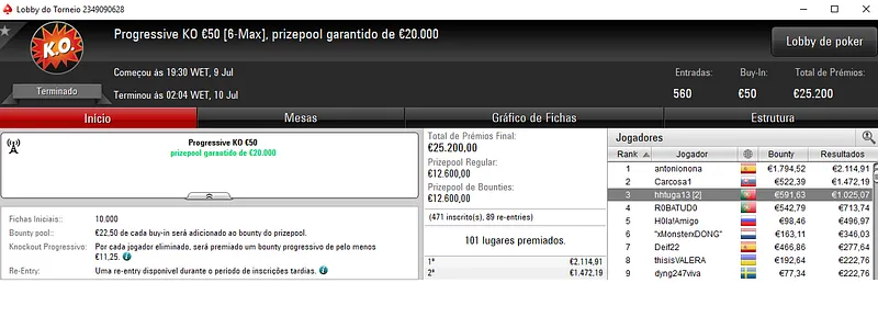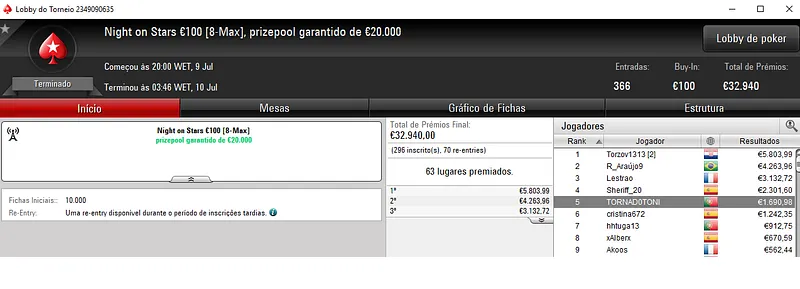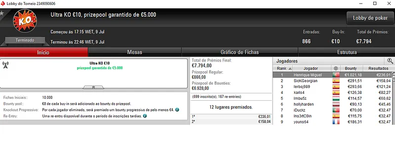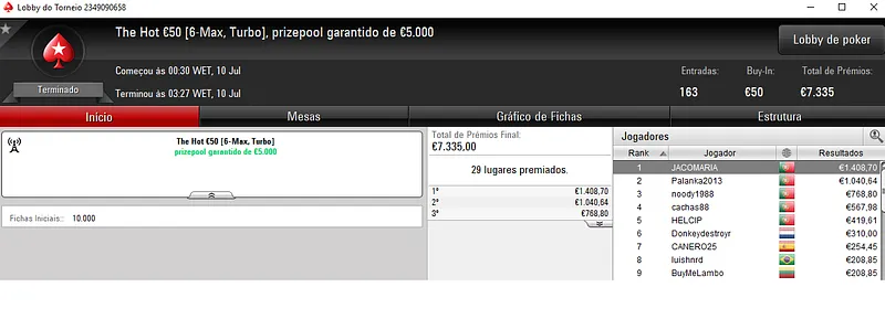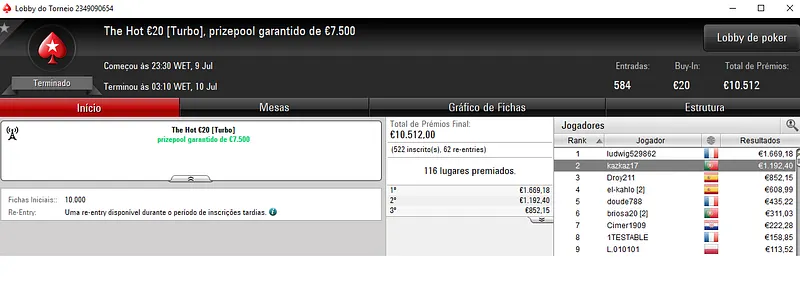 Já no Uppercut €20 com 1,300 entradas e €23,400 de prize pool, hugo_fcp teve direito a €2,942 de prémio pela conquista do torneio. Na segunda posição, badoca7 encaixou €1,565, entre prémio e bounties.