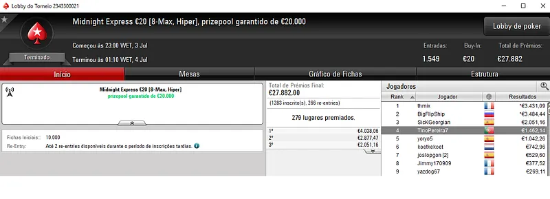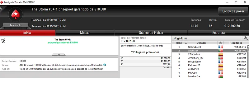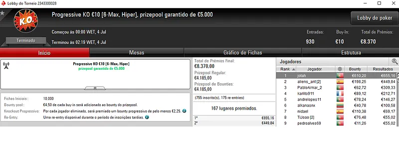 Já com a medalha de prata no The Hot BigStack Turbo €50, kokonakueka teve direito a €2,204 de prémio. Aqui participaram 498 jogadores e o prize pool de €22,410 foi repartido pelos 98 melhores classificados.