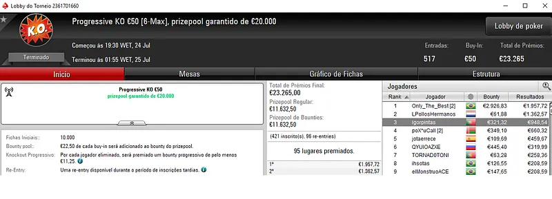 O maior resultado aconteceu com a vitória de rmgil no The Big €50 com 420 entradas. O prize pool deste torneio ascendeu aos €18,900, com o jogador luso a embolsar €3,082 de prémio. No total, 80 jogadores saíram com prémios deste torneio.
