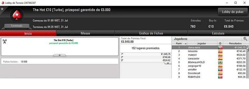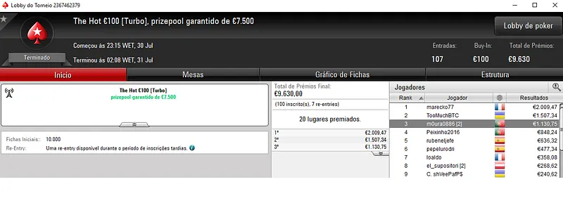Já no Midnight Express €20, joniantan6 recebeu a medalha de prata e €2,772 de recompensa. Este torneio acolheu 1,485 entradas e o prize pool de €26,730 foi dividido pelos €263 melhores classificados. Na quarta posição, TiJoao faturou €1,408, enquanto joaobdff teve direito a €1,004 na posição seguinte.