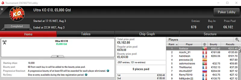 Com o maior prémio saiu El Patronn87 que foi o campeão do Ultra KO €20 com 762 entradas. Este torneio distribuiu €13,716 de prize pool e o jogador luso encaixou €1,886, entre prémio e bounties.
