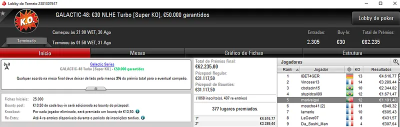 Também sirlu1sao saiu com a medalha de bronze no Evento #49: €125 NLHE Galaxy [Deep Hyper, Progressive KO] com 618 entradas. Este torneio distribuiu o prize pool garantido de €75,000, onde o jogador português recebeu €4,079, entre prémio e bounties.