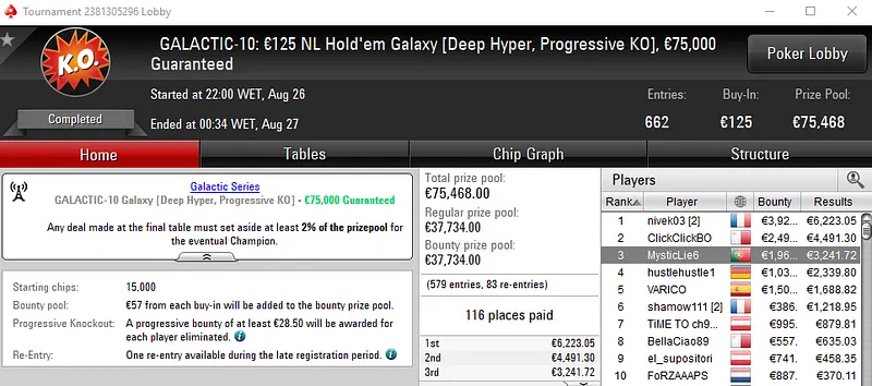 A medalha de prata apareceu no Galactic Series #03: €10 The Classic [Progressive KO], onde o prize pool garantido de €150,000 não foi atingido. Com 14,331 participantes, ruiatg perdeu o heads-up e embolsou €7,985, entre prémio e bounties. Também com um prémio de quatro dígitos, FredPokerPt saiu na sexta posição para €2,526.