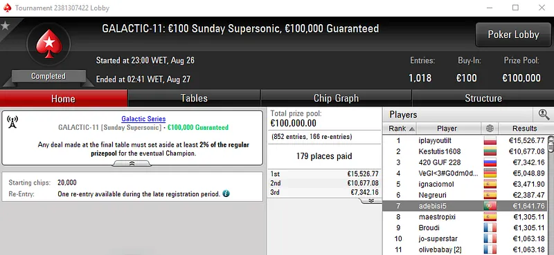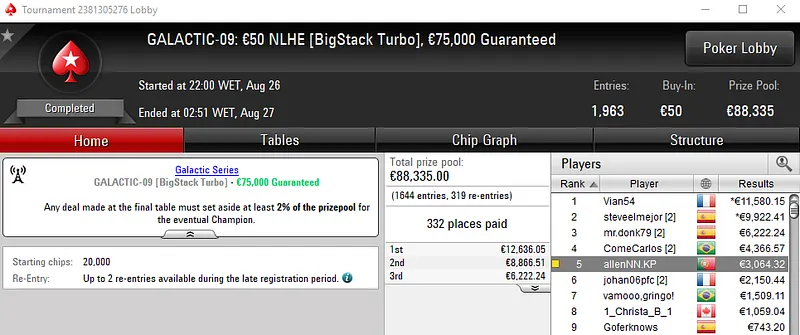 Já no Galactic Series #01: €50 NLHE [Warm-Up], elementos69 voltou a mostrar a sua habilidade no poker e embolsou €10,093 de prémio pela quarta posição. Este evento acolheu 4,799 entradas, onde o prize pool de €215,955 foi repartido pelos 872 melhores classificados. Allen.PK foi sexto e faturou €4,970, enquanto Coderniza recebeu €3,488 na sétima posição.