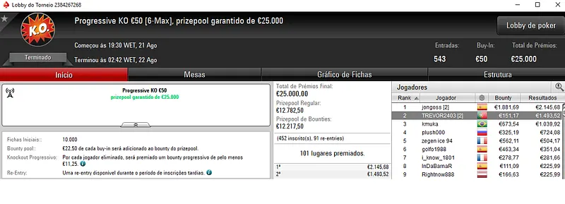 A medalha de ouro valeu €2,025 a jotinhah no Ultra KO €20 com 745 entradas. Este torneio teve um prize pool acumulado de €13,410.