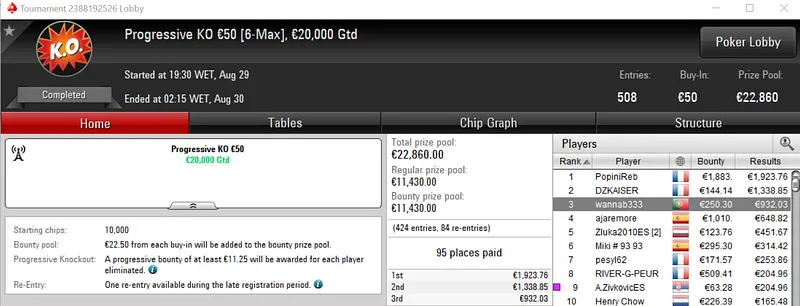 Já no The Hot €50, o conhecido KeyzerSozePT ultrapassou as 234 entradas do torneio para receber €1,941 de prémio. Este torneio teve um prize pool acumulado de €10,530, onde 41 jogadores saíram com prémios.