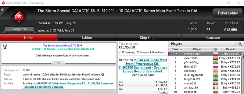 O maior prémio apareceu com a vitória de Kuatro no The Storm €10 com 648 jogadores. O prize pool deste torneio chegou aos €14,535 e o jogador luso levou para casa €2,240 de prémio.