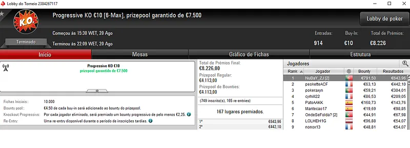 Com o título de campeão do Progressive €30 com 818 entradas, eazyomg10 embolsou €3,636, entre prémio e bounties. Este torneio teve um prize pool acumulado de €22,086.