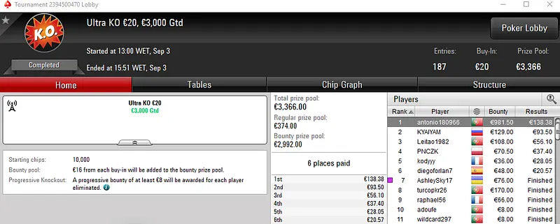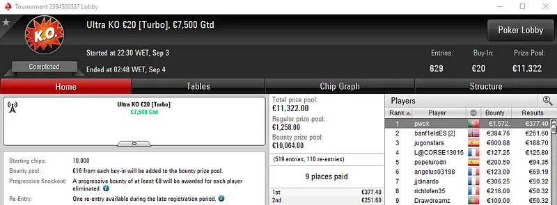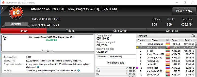 Já no Progressive KO €30 com 1,102 entradas, Wgakiters perdeu apenas no heads-up e foi recompensado com €2,236, entre prémio e bounties. Este torneio contou com um prize pool de €29,754.