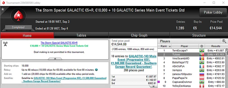 O maior prémio apareceu com a vitória de BrPe no The Big Special Galactic €10 com 2,065 entradas. O jogador lusos levou para a sua conta €2,158 de prémio e ainda um bilhete para o Main Event das Galactic Series no valor de €250. Este torneio distribuiu €18,585 pelos 415 melhores classificados.