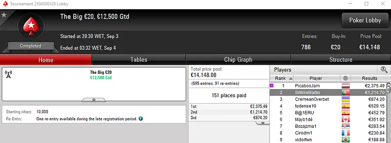 Resultados na PokerStars.pt: