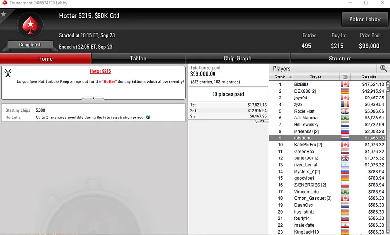 Também com uma boa sessão terminou Rui "sousinha23" Sousa que acrescentou três mesas finais ao seu currículo. O maior prémio apareceu com o sétimo posto no Sunday 500 com 289 entradas e $144,500 de prize pool. O luso faturou $4,663 de prémio e ainda viu Michel "FreeLancerZZ" Dattani sair com $1,208 em 36º.