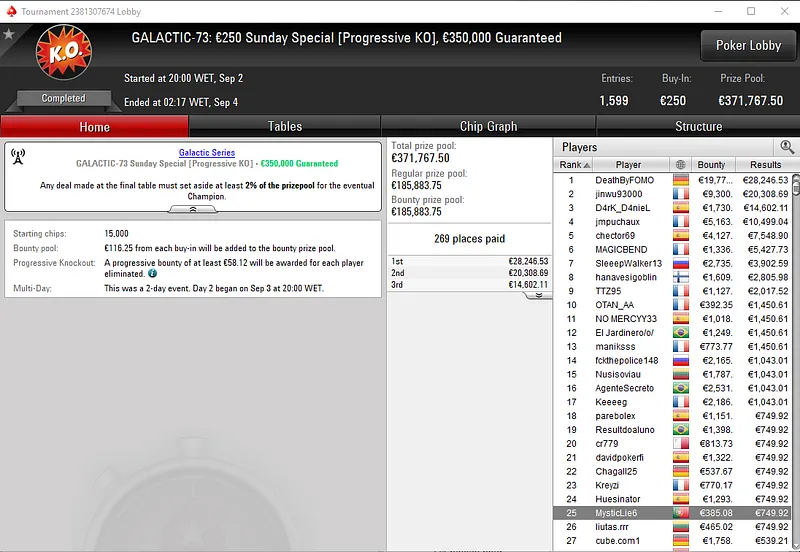 O Galactic #87: €125 NLHE [Deep Hyper, Progressive KO] registou 708 entradas, que se traduziram em €80,712 de prémio acumulado. Na terceira posição, Fuck srj levou para a sua conta €4,008 de recompensa pelo desempenho. MFpower27 terminou na quinta posição e ainda embolsou €3,095.