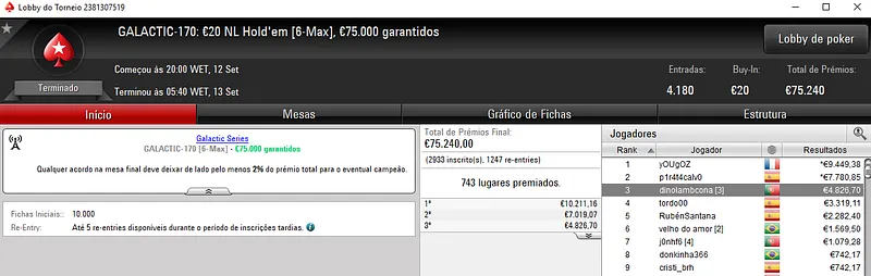Flashynho sagrou-se campeão do Galactic #168: €50 NLHE com 2,261 entradas e €101,745 de prize pool. Com prémios para os 404 melhores classificados, o jogador luso teve direito à maior fatia, cerca de €14,371.
