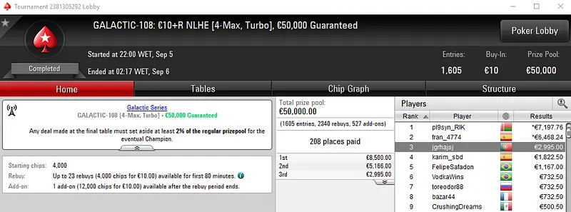 Com 625 entradas, o Galactic #107: €125 NLHE [Deep Hyper, Progressive KO] distribuiu o prize pool garantido de €75,000. O quarto posto da classificação valeu €3,595 a narceja66.