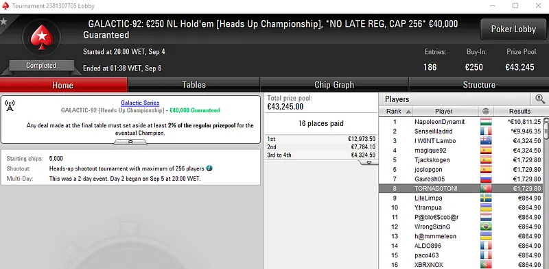 Já no Galactic #102: €20 NLHE [6-Max] com 4,236 entradas e €76,248 de prize pool, Goodfella.PA recebeu a medalha de bronze. A excelente prestação do jogador luso valeu €5,698, depois de fazer acordo no 4-handed. Na sétima posição, joaobarb teve direito a €1,092.