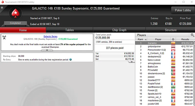 Já no Galactic #144: €20 NLHE [SuperStack] todo o pódio ficou vestido com as cores nacionais. Na primeira posição, aksvasko embolsou€8,171, após acordo com Ricardoscp25 que recebeu €6,441 em segundo. Na terceira posição, pmcpkr levou para a sua conta €4,228. Com 3,497 entradas, este evento teve um prize pool acumulado de €62,946.