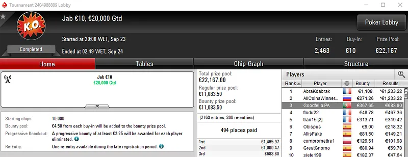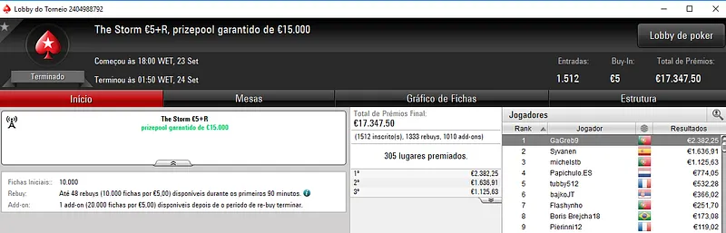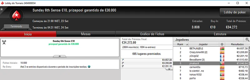 Faria73 foi o campeão do Sunday Starter €10 e levou para casa a maior fatia do prize pool de €33,453, cerca de €3,636. Ele chegou a acordo no heads-up e deixou para trás o field com 728 entradas. A quarta posição deu direito a €1,400 de prémio para Dani19941983.