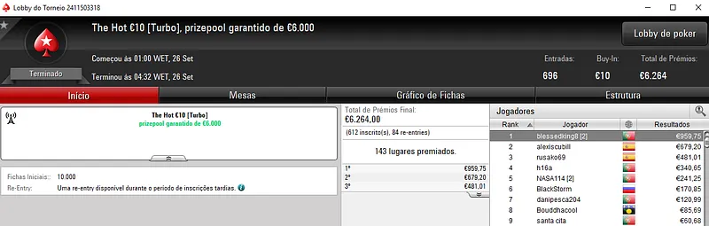 Depois de perder o heads-up, missteta75 teve direito a €2,604 no The Hot BigStack Turbo €50 com 501 entradas. aqui, o prize pool de €22,545 foi distribuído pelos 98 melhores classificados.