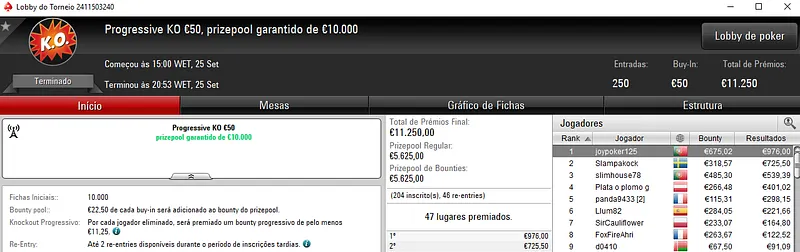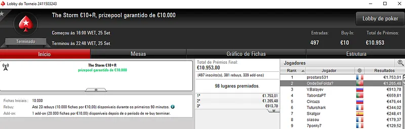 O maior resultado foi para a vitória de NãoTeAtrevas no Uppercut €20 com 1,423 entradas. O prize pool deste torneio chegou aos €25,614 e o jogador português embolsou €3,853, entre prémio e bounties.