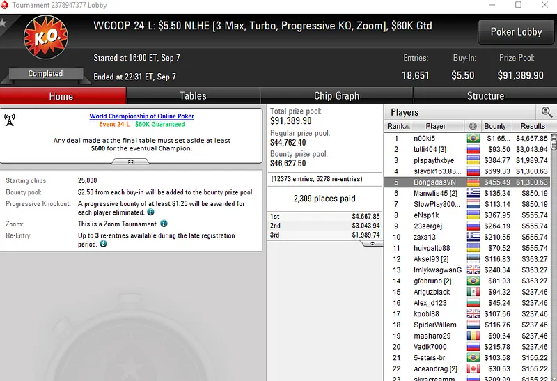 Dattani ainda recebeu mais $1,058 no WCOOP #24-High: $530 NLHE [3-Max, Turbo, Progressive KO, Zoom] com 1,209 entradas. Ele foi 115º classificado, onde o melhor luso foi Rui "sousinha23" Sousa que terminou em 104º para $1,152. Tomás Paiva ainda recebeu $1,370 em 121º, enquanto Luís Dono faturou $1,334 em 136º.