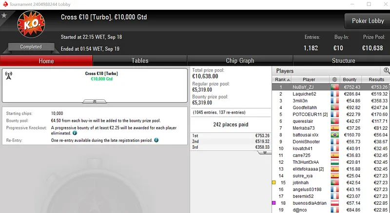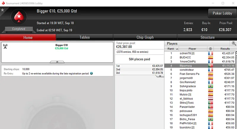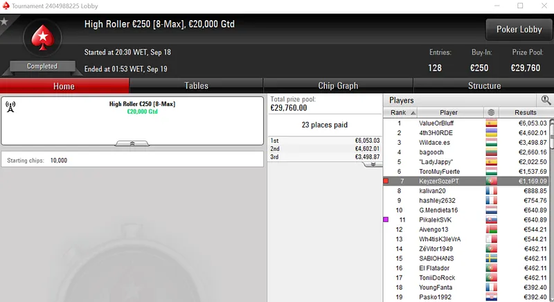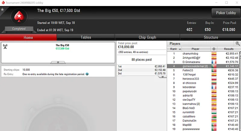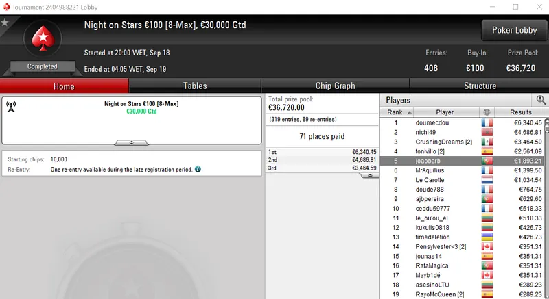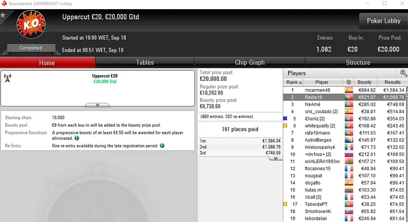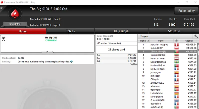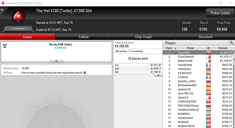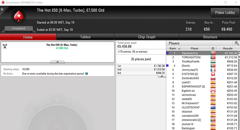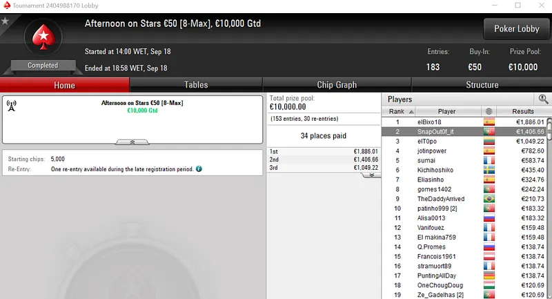Rui "RuiBouquet" Bouquet foi o jogador que conseguiu esse feito ao conquistar o Midnight Express €20 com 1,366 entradas. O jogador luso embolsou €3,672 de prémio, entre os 247 jogadores que repartiram o prize pool de €25,000.