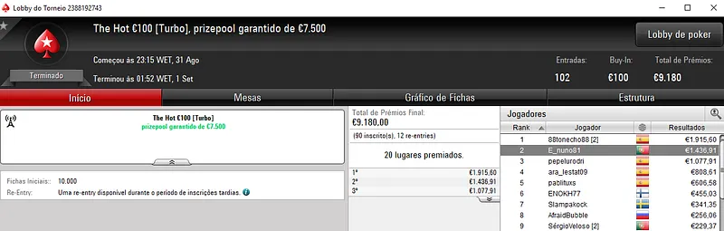 O maior vencedor do dia e único luso que atingiu os dois milhares nos torneios regulares da PokerStars.FRESPT foi automuckaces, que venceu o Uppercut €20. Este torneio acolheu 898 entradas que se traduziram num prize pool acumulado de €17,500. O nosso representante saiu com o título e €2,532, entre prémio e bounties.