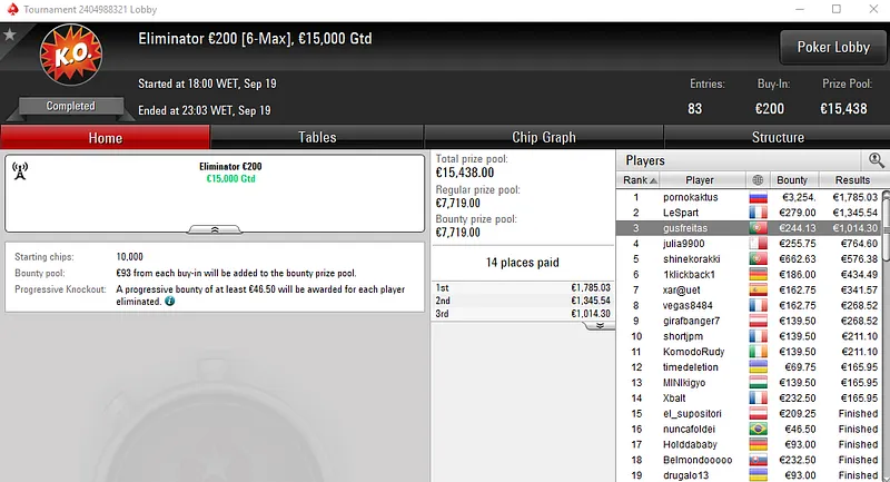 A vitória de iDuckz no The Hot BigStack Turbo €50 com 491 entradas e €22,095 de prize pool deu direito a €3,911 de prémio. O torneio distribuiu o prize pool pelos 98 melhores jogadores em prova, onde o luso precisou apenas de 4 horas para sair vitorioso.