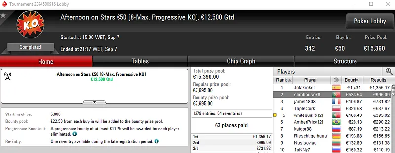 Assim, o melhor jogador luso na sessão de ontem foi RaiseMachin3 que se sagrou campeão do Ultra KO €20 com 567 entradas e €10,206 de prize pool. O jogador luso não deu hipóteses à concorrência e levou para a sua conta €1,744, entre prémio e bounties.