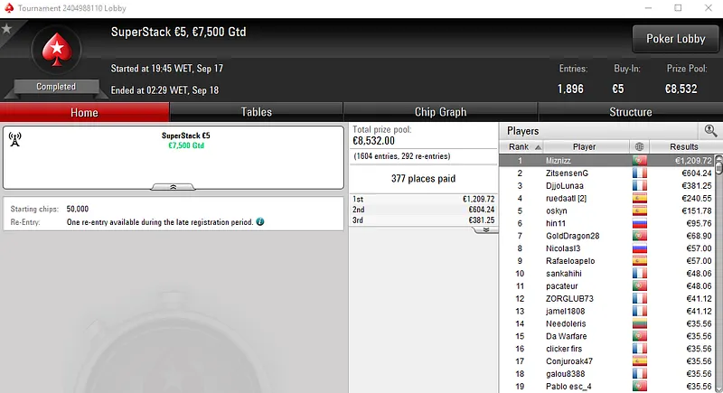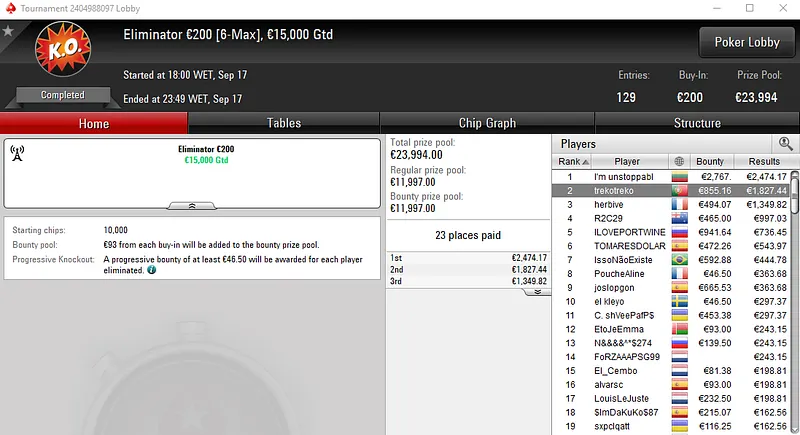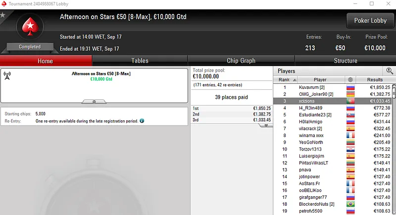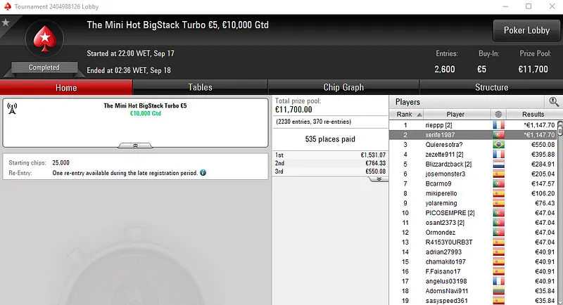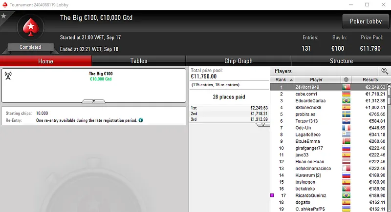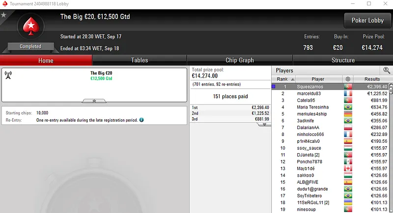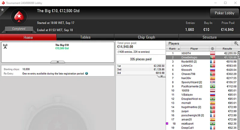 Já no The Big 50 com 478 entradas, alibumaye90 embolsou €3,442 pelo título. Aqui, o prize pool de €21,510 foi distribuído pelos 98 melhores classificados.