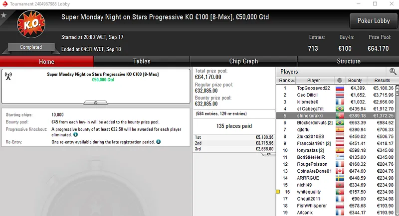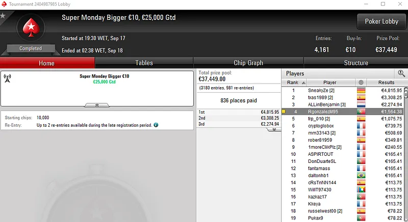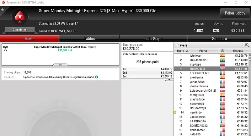 Com 653 entradas, o Super Monday Hot BigStack Turbo €50 viu três lusos arrecadarem prémio de quatro dígitos. O melhor classificado foi ninesoup que faturou €3,212 na segunda posição. A medalha de bronze rendeu €2,279 a sirlu1sao, com TORNAD0TONI a embolsar €1,147 em quinto.