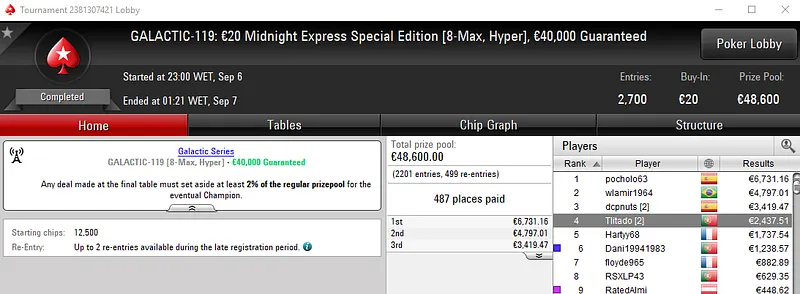Timjequim foi o jogador luso que conseguiu esse feito ao conquistar o Galactic #113: €20 NLHE [SuperStack] com 3,122 entradas. Este evento teve um prize pool acumulado de €56,196, onde o jogador luso embolsou €7,029 depois de realizar acordo no heads-up.