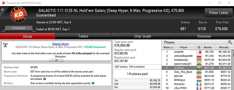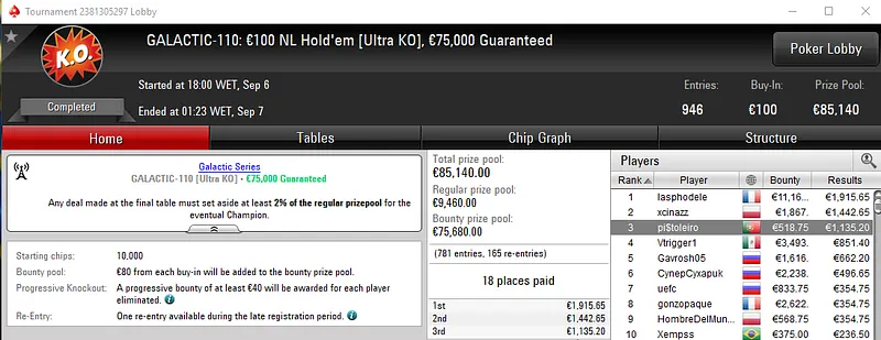 Já o maior prémio apareceu com a medalha de prata de Luckytobme no Galactic #116: €50 NLHE Turbo Thursday Galactic com 1,624 entradas e €75,000 de prize pool. Depois de perder no heads-up, o português levou para a sua conta €8,194 de prémio. Na sexta posição, CrushMeDonK saiu com €2,189, entre os 269 premiados deste torneio.