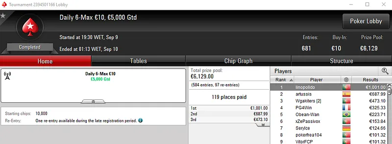 O The Hot €20 contou com 1,133 entradas e €20,394 de prize pool acumulado. No segundo lugar da classificação, AmaniacA encaixou €2,008, entre os 233 jogadores que saíram premiados deste evento.