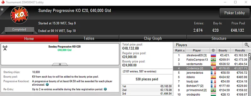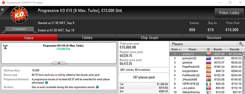 Já PsyDuarte foi o campeão do Progressive KO €10 e por isso foi recompensado com €2,033 de prémio. Este evento acolheu 2,142 entradas que perfizeram um prize pool de €19,278, em que o português levou o maior prémio.