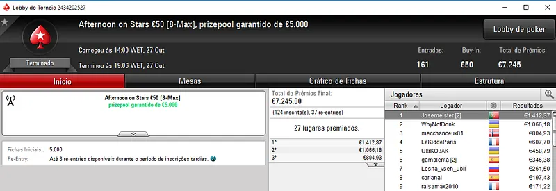O maior resultado apareceu com a medalha de prata de afonsog11 no Night on Stars €100 com 280 entradas. O torneio teve um prize pool acumulado de €25,200, com o luso a encaixar €3,431 de prémio. Na quinta posição, Kuatro teve direito a €1,462.