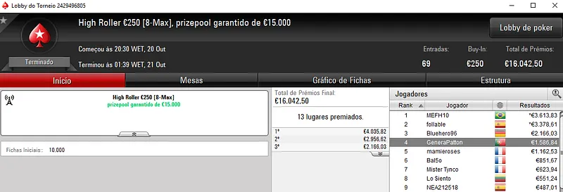 O grande vencedor do dia foi TORNAD0TONI que sai com a medalha de bronze do Night on Stars €100 com 303 entradas. O prize pool deste torneio chegou aos €27,270, onde apenas 55 jogadores arrecadaram prémios. O português embolsou €2,650, o único resultado acima dos dois mil euros na sessão de ontem.
