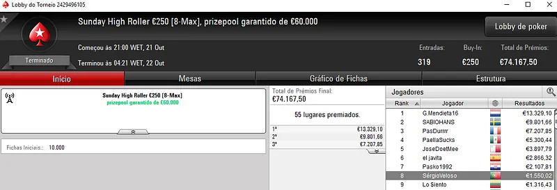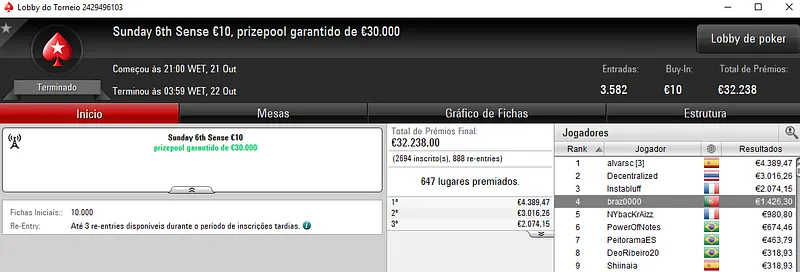 O maior vencedor foi chilipe22 que se sagrou campeão do Sunday Starter €10 com 4,072 entradas. O jogador luso não deu hipóteses à concorrência e arrecadou €4,716 de prémio. Este torneio distribuiu €36,648 pelos 800 melhores jogadores em prova.