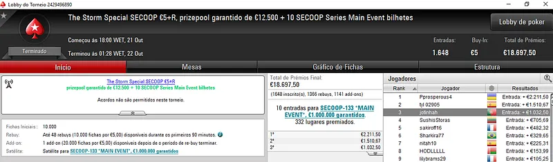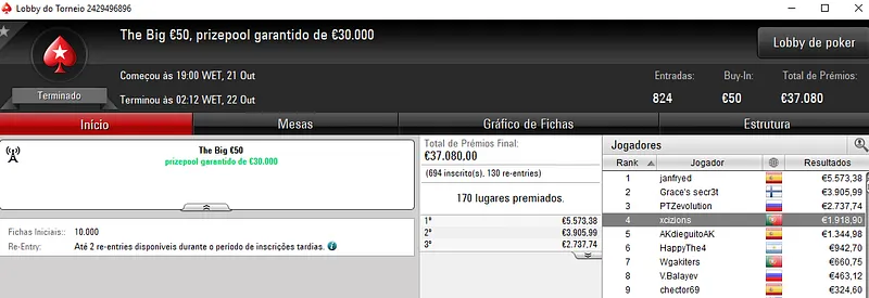 Já no Midnight Express €20 foi a vez de pinoquio7 brilhar e trazer também a medalha de ouro. Aqui foram registadas 2,044 entradas com o prize pool a ascender aos €36,792. O português encaixou €3,872 após acordo no 3-handed.