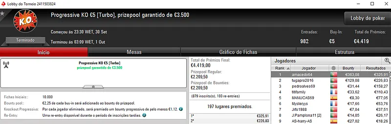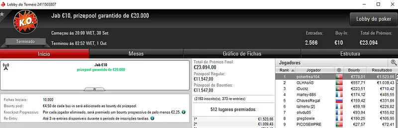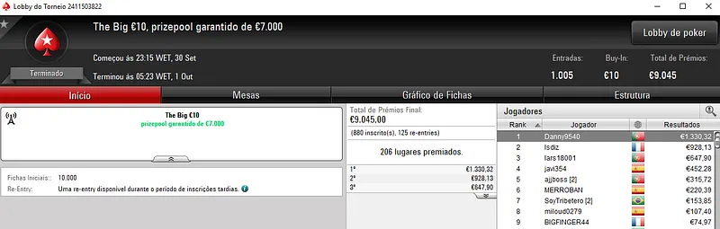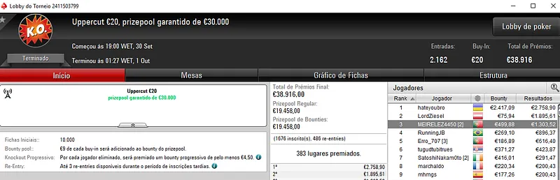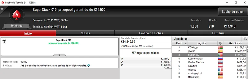 Destaque ainda para sirlu1sao que acumulou dois bons resultados na sessão de ontem. O maior apareceu com a vitória no Ultra KO €20 que rendeu €2,630. Este evento contou com 834 entradas e €15,012 de prize pool.