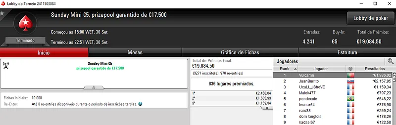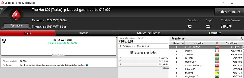 Já no The Hot €100, sirlu1sao encaixou mais €1,278 na quarta posição. Aqui o prize pool de €15,000 foi repartido pelos 27 melhores classificados, entre as 143 entradas registadas.